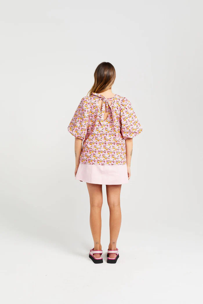 She has voluminous puff sleeves and a self fabric bow in the back.