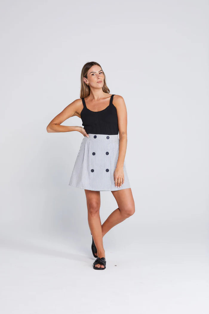 The Zib Skirt is the Lib Skirt's non-identical sister, featuring a double-breasted button closure and an elasticated back for comfort. Comfy but still cool - it's a win-win.